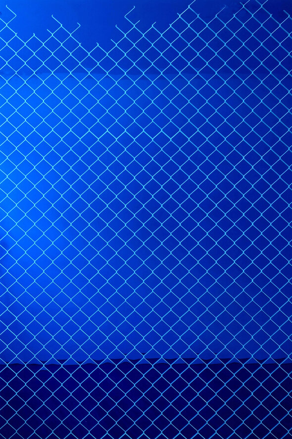 Obwohl Hosking´s Arbeiten oft abstrakt in ihrem Charakter wirken, bezieht er sich auf ganz bestimmte Referenzen wie Silhouetten, den Rorschachtest, Camouflage und nun Umzäunungen. Die neueste Arbeit erlaubt uns zu sehen, was sich außerhalb dessen befindet, doch hindert uns am Eintreten. Visuell fragil, doch ist es eine wirksame Barriere.