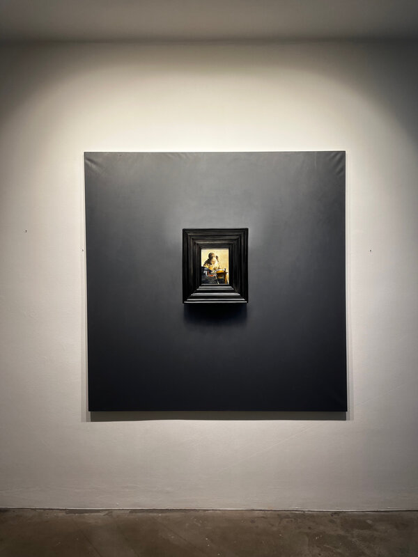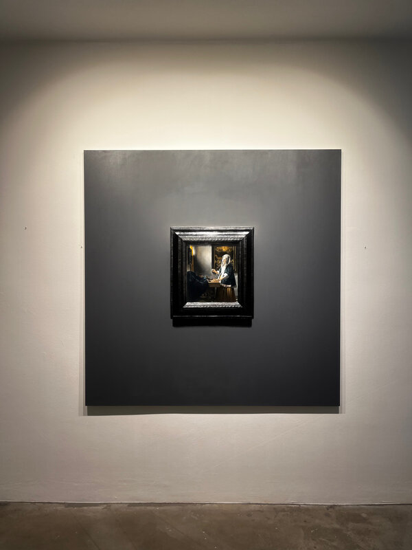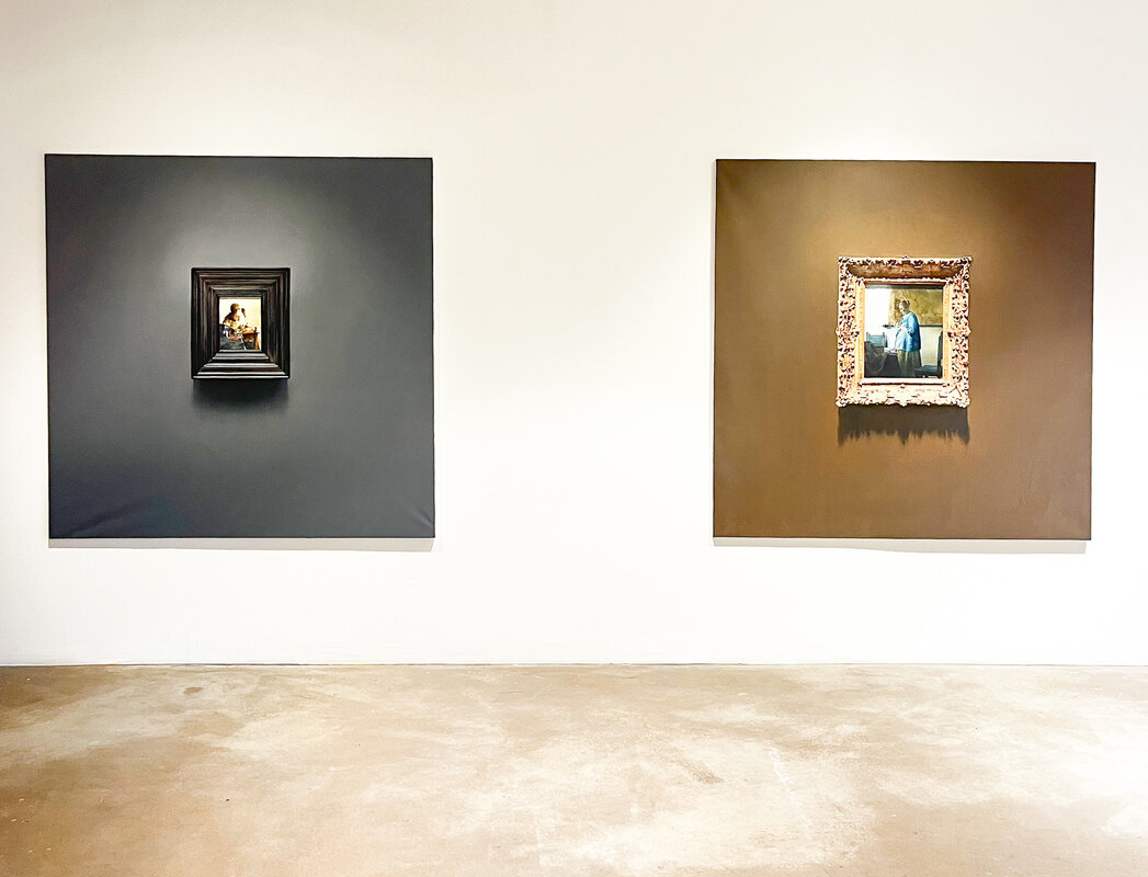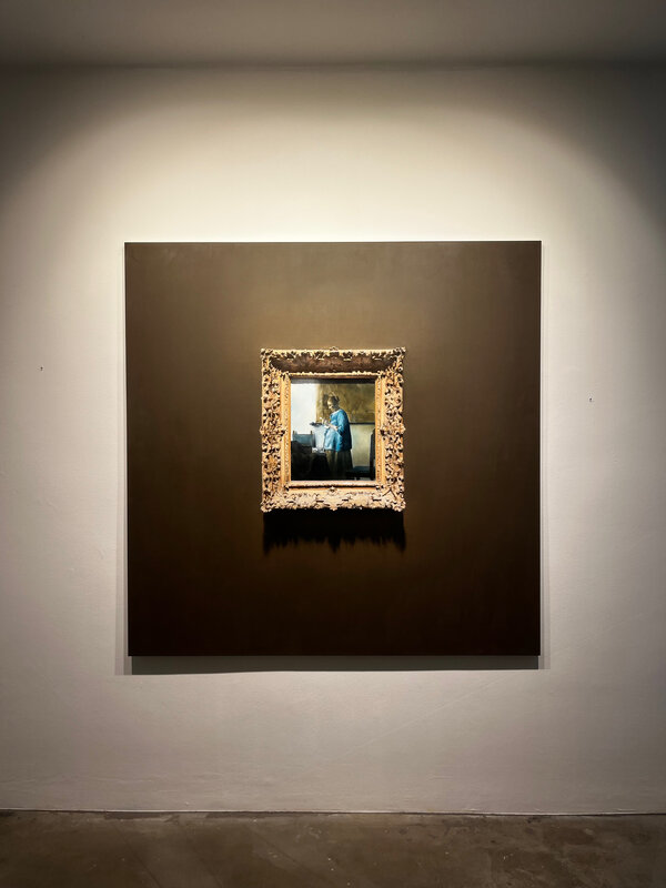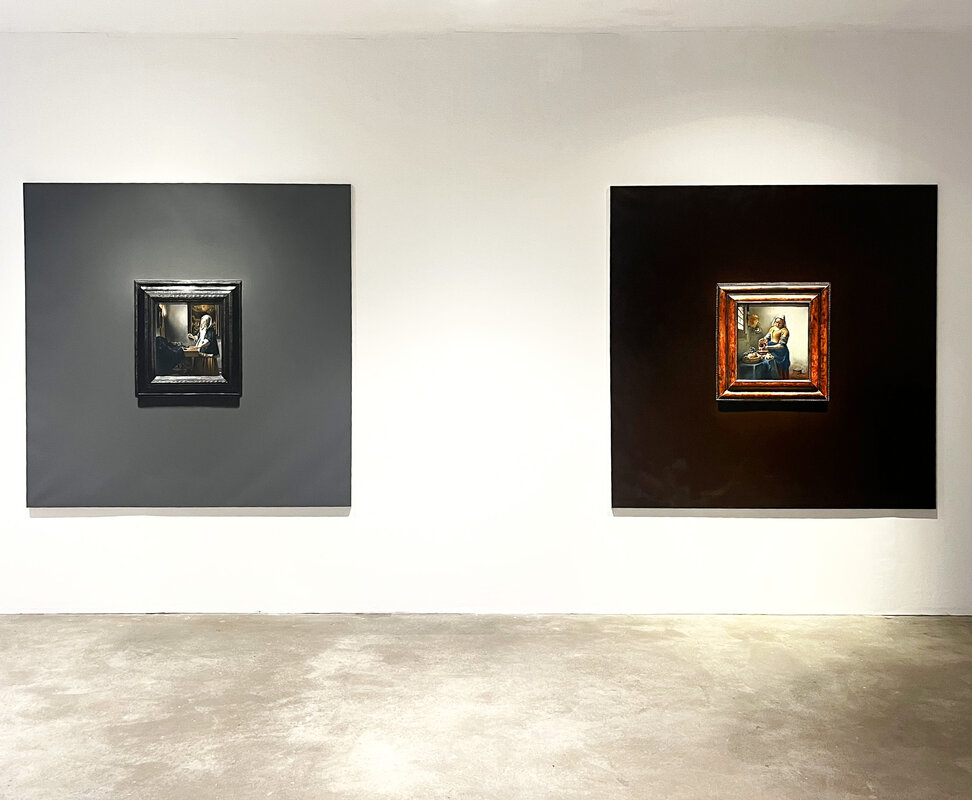 The paintings from the Museum Walls series presented in this exhibition at the Michael Fuchs Gallery in Berlin specifically reference the great 2023 Vermeer exhibition at the Rijksmuseum in Amsterdam. The artist’s game is to “relocate” six fragments of this historic artistic event to the heart of Berlin. Girbent strips these paintings—classical in appearance but radically contemporary in essence—of all distractions. He paints only three elements: painting, frame, and wall. These elements are carefully assembled using precise light and shadow effects, creating a powerful optical illusion, a visual sensation reminiscent of trompe-l’œil. However, this illusionistic effect—while undoubtedly attention-grabbing—is not the most interesting aspect of these works. As we have stated, the artist re-creates a series of walls. These paintings do not refer to any specific captured moment: they appear to be a moment frozen in time, but they are not. In reality—and here we move beyond appearances once again—they are constructions, not impressions.