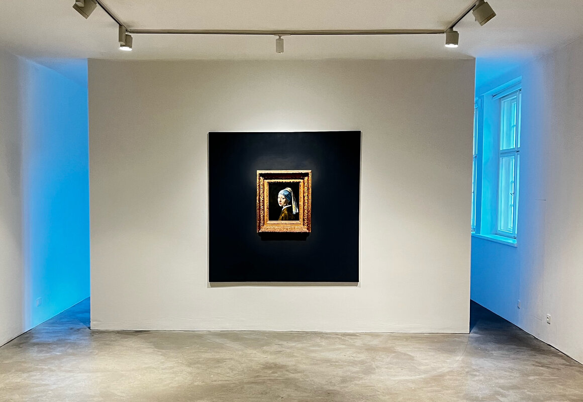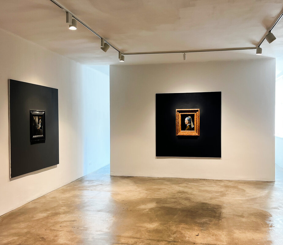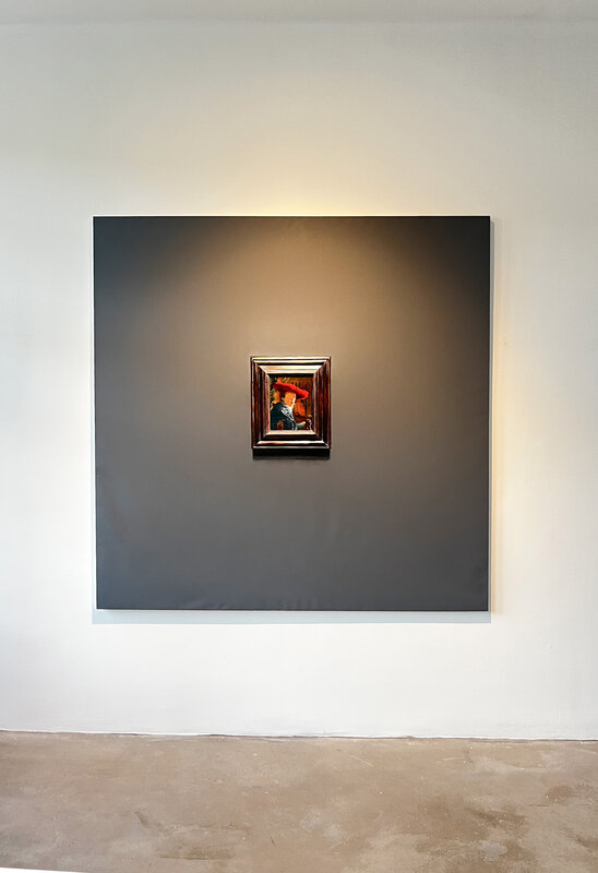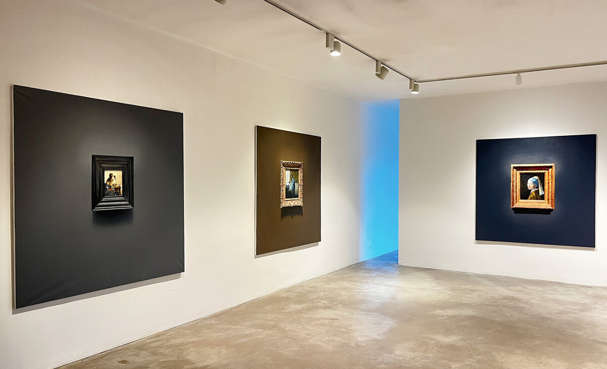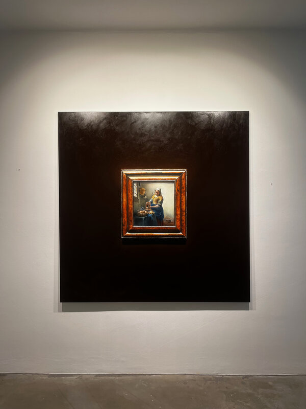 The paintings from the Museum Walls series presented in this exhibition at the Michael Fuchs Gallery in Berlin specifically reference the great 2023 Vermeer exhibition at the Rijksmuseum in Amsterdam. The artist’s game is to “relocate” six fragments of this historic artistic event to the heart of Berlin. Girbent strips these paintings—classical in appearance but radically contemporary in essence—of all distractions. He paints only three elements: painting, frame, and wall. These elements are carefully assembled using precise light and shadow effects, creating a powerful optical illusion, a visual sensation reminiscent of trompe-l’œil. However, this illusionistic effect—while undoubtedly attention-grabbing—is not the most interesting aspect of these works. As we have stated, the artist re-creates a series of walls. These paintings do not refer to any specific captured moment: they appear to be a moment frozen in time, but they are not. In reality—and here we move beyond appearances once again—they are constructions, not impressions.
